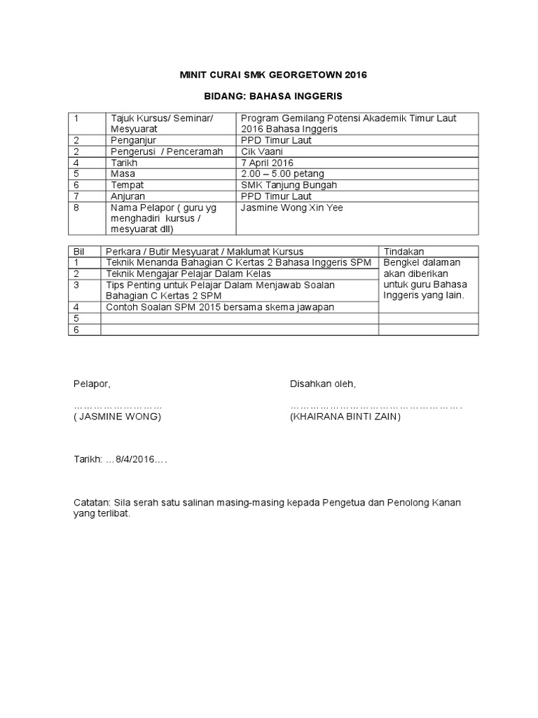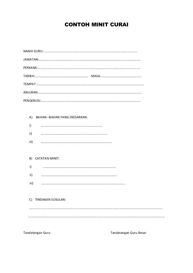Minit curai adalah laporan ringkas yang ditulis oleh guru yang menghadiri kursus, bengkel, mesyuarat atau perkara yang seumpamanya dengan tujuan tidak berlaku kecairan maklumat untuk disampaikan kepada barisan pentadbir dan juga ajk latihan dalam perkhidmatan peringkat sekolah nanti. Minit mesyuarat menjadi bahan rujukan, tindakan susulan, pelaporan semula untuk mesyuarat akan datang dam nerfungsi sebagai bukti rasmi salah satu punca kuasa atas sebarang arahan kerja dalam sesebuah organisasi. Disini kami akan kupas tuntas seputar surat pemberitahuan dan kami juga akan berikan kepada anda contoh surat pemberitahuan yang baik dan benar. Tandatangan pelapor, diterima & disahkan. Semoga perkongsian contoh minit mesyuarat ini dapat membantu anda menghasilkan minit mesyuarat yang lengkap.