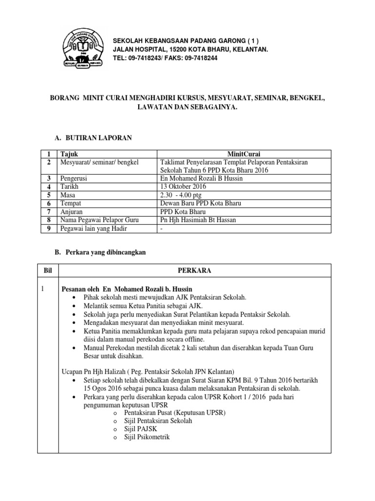 Minit mesyuarat atau minutes of meeting (mom) merupakan dokumen yang penting dalam mengetahui perjalanan sesuatu mesyuarat. # contoh laporan program kokurikulum 2018. Rujukan bil borang laporan / minit curai nama pegawai : Minit mesyuarat menjadi bahan rujukan, tindakan susulan, pelaporan semula untuk mesyuarat akan datang dam nerfungsi sebagai bukti rasmi salah satu punca kuasa atas sebarang arahan kerja dalam sesebuah organisasi. Contoh minit curai ppd hip.