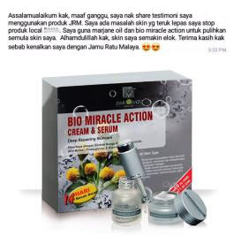 Penggunaan bio miracle action membantu melambatkan proses penuaan, membantu memperbaharui kulit, membantu menegangkan kulit, membantu untuk masalah jeragat, jerawat dan menyerikan kulit.